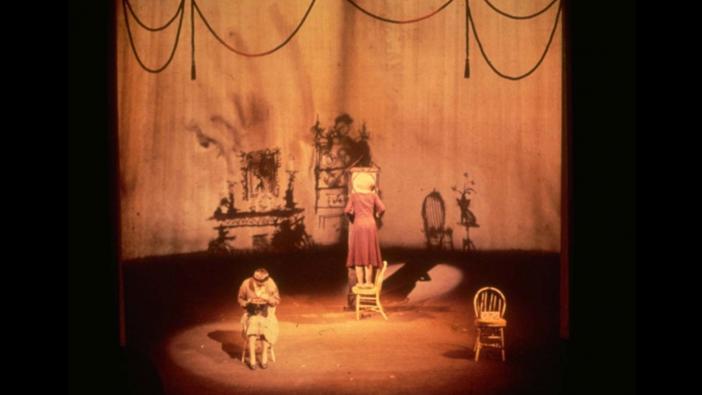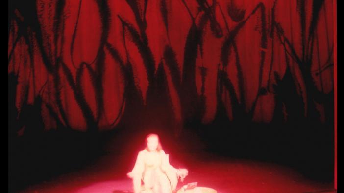 Front projection onto curved cyclorama. 18x18cm (7"x7") pre-distorted slides manufactured by Theatre Projects Lighting. Photographed from model in single tint, then hand colored. Projected from two 5KW Reiche and Vogel Projectors from towers either side in false proscenium.
