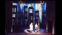 Front projection onto flat screen with openable panels integrated with images. 18x18cm (7"x7") pre-distorted slides manufactured by Theatre Projects Lighting. Photographed from model in single tint, then hand colored. Projected from two, 5KW Reiche and Vogel Projectors, fitted with innovative remote controlled 36-slide changers from overhead bridge mounted behind proscenium.