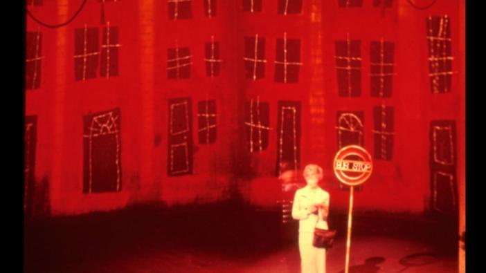 Front projection onto curved cyclorama. 18x18cm (7"x7") pre-distorted slides manufactured by Theatre Projects Lighting. Photographed from model in single tint, then hand colored. Projected from two 5KW Reiche and Vogel Projectors from towers either side in false proscenium.