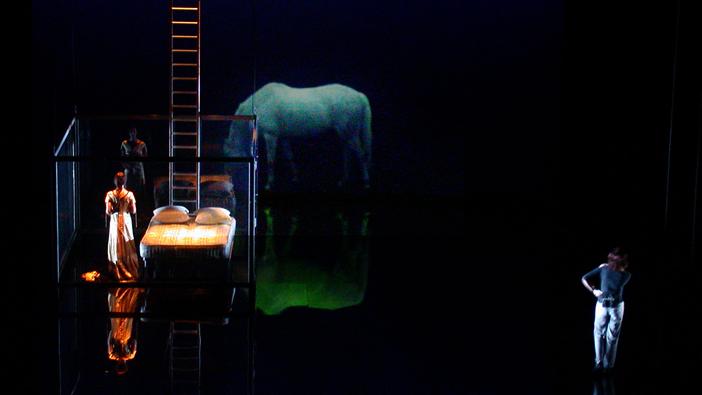 Featured underwater filming of Saffron Burrows and a beautiful white orse. Projection onto multiple moving surfaces from front ,rear and overhead projectors and flown video monitors.