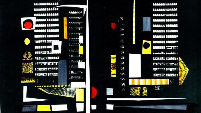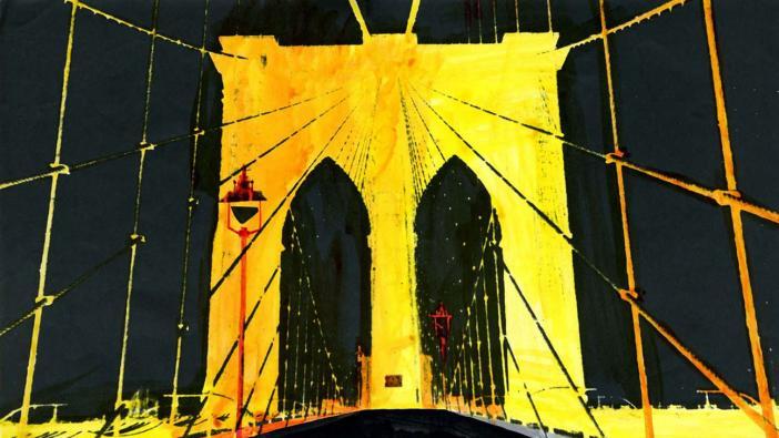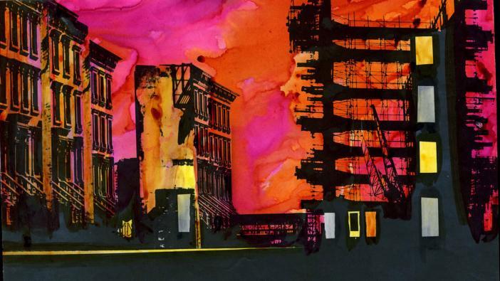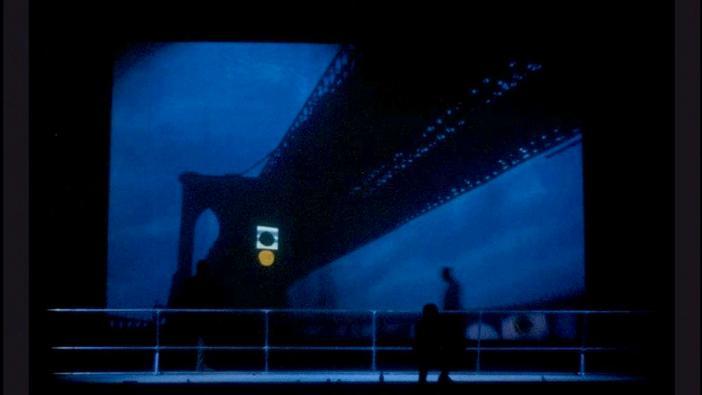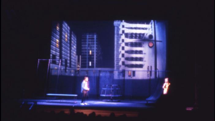 Front projection onto flat screen. 18x18cm (7"x7") pre-distorted slides manufactured by Theatre Projects Lighting. Photographed from model in single tint, then hand colored. Projected from two, Century 5kw Projectoramas from overhead bridge mounted behind proscenium.